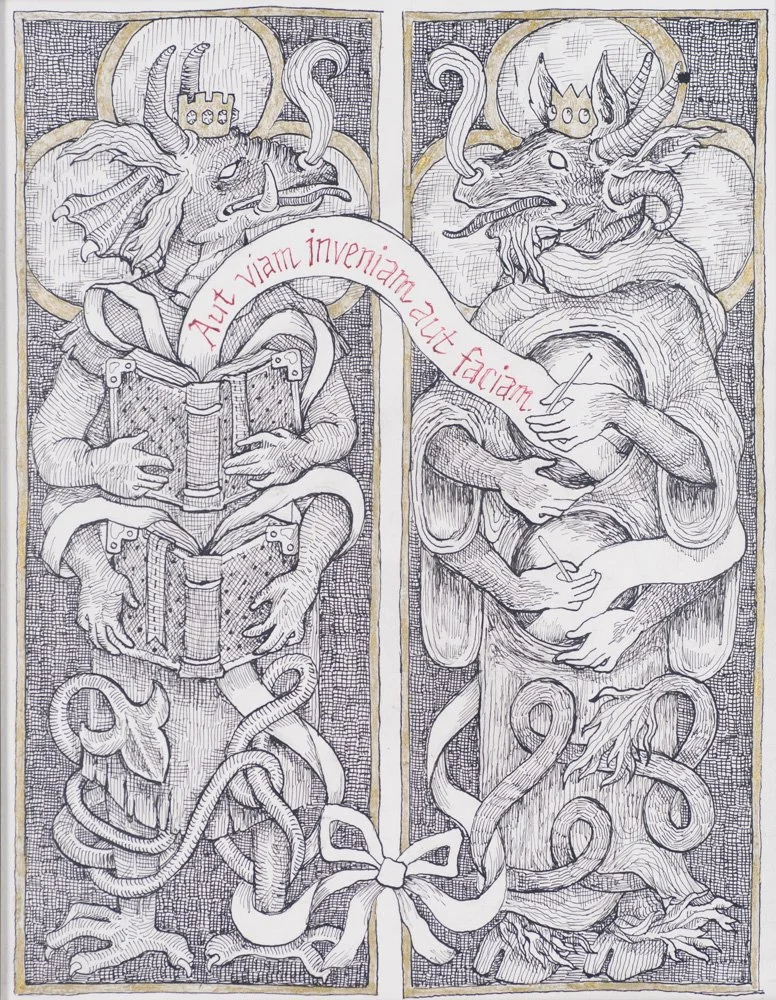 “Aut viam inveniam aut faciam” : Either I will find a way, or make one... What part of my life, what small facet has my illness not touched? My art is no exception. Two years ago, I was placed in a psychiatric hospital, and in an act of self-preservation, I established the practice of creating one sketch a day. At the end of my stay, I had a makeshift portfolio and the opportunity for an apartment in Phoenixville, an aptly named town in which I could recover and rise. Since then, the darkness that had once clouded my mind has dissipated, revealing great imagination and insight, though images of the darker days sometimes pervade my work. The monsters in this piece are figures that have plagued me when I was ill in the past, appearing in long-gone moments of riddled psychosis. In my art, I have tamed them with the power of the pen, and I have caged them with ink; I have the power to overcome the devastating challenges of my past. The Latin phrase is one I have always carried with me and is one that I often repeated in my hospitalization. Now, on the other side, I can proudly confirm that I have both found my way and will forge one going forward, accomplishing a life for myself I never could have dreamed was possible.